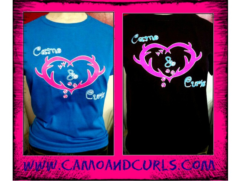 Our antler heart design in hot pink with turkey and deer tracks drawn and designed by us and printed on various color shirts in youth sizes, thanks for looking.